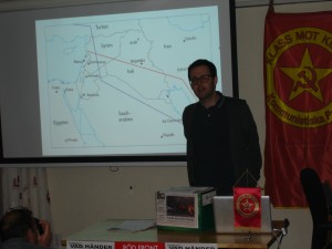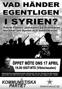 Onsdag 17 april gästades Växjö av Proletärens utrikesredaktör Patrik Paulov. Under lång tid har han bevakat utvecklingen i Syrien och den här kvällen fick åhörarna se bilder och höra berättelser som svensk och internationell media förtigit och förvanskat. Den gängse mediabilden från Syrien som visas är betydligt med komplicerad än vad media för fram. Patrik resonerade kring vem som tjänar på kriget, vem som skapat våldsspiralen samt vem som vill ge freden en chans och vilka som avvisar den? Frågorna efter föredraget var många och åhörarna visade stor tacksamhet för att Patrik rest runt i Sverige för att informera om detta.