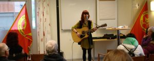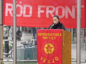 Röd Front i Växjö 2018 hade kvinnor och kvinnofrågor i centrum. Talade gjorde Susanna Eriksson (K) och Gabriela Inostroza (K), sång och musik framfördes av Miranda Murre Eriksson.