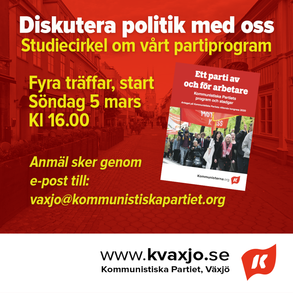 Anmälan sker genom att skicka e-post till: vaxjo@kommunistiskapartiet.org med namn, adress, telefonnummer och e-postadress.